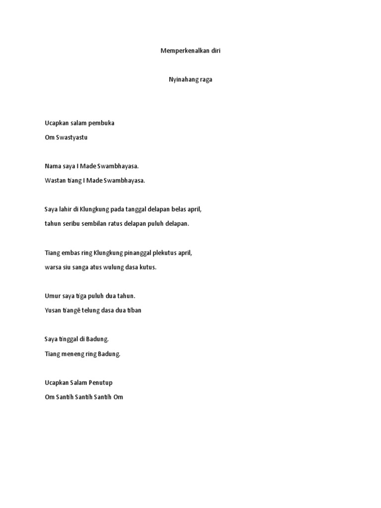 Bahasa bali memperkenalkan diri. Mantap Belajar dengan Widiatmika. OM SWASTIASTU Selamat pagi pak Guru dan teman-teman semuanya bagaimana kabarnya hari ini perkenalkan nama saya Made. Cara Memperkenalkan Diri dalam Bahasa Inggris Memperkenalkan diri adalah salah satu cara untuk menyampaikan siapa anda dan memberikan gambaran kepada orang lain tentang diri anda.