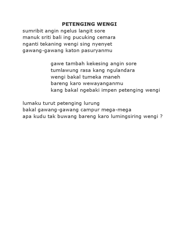Puisi bahasa jawa pendek. Kalau belum yuk simak penjelasan mengenai geguritan dan contoh-contoh geguritan. Puisi adalah sebuah seni tertulis yang memperhatikan estetis dan simantis. Kata geguritan atau puisi Jawa dalam kamus Baoesastra berasal dari kata gurit yang artinya tulisan.
