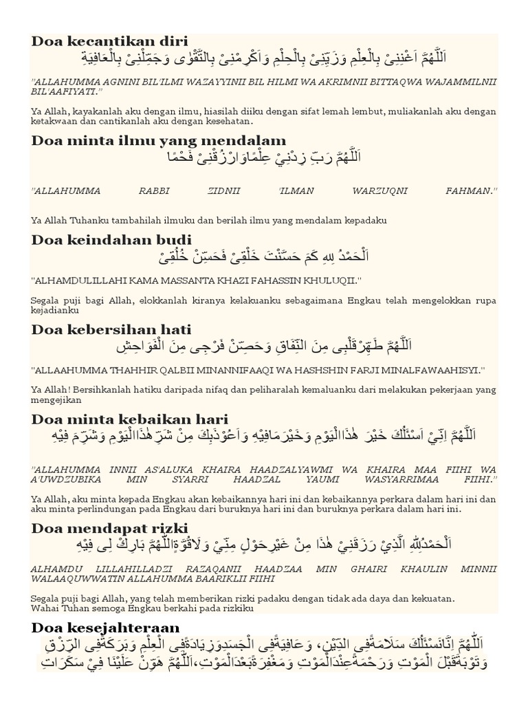 Allahumma agnini bil ilmi wazaiyinni bilhilmi waakrimni bittaqwa wajammilni bilafiyat. ALLAHUMMA AGNINI BILILMI WAZAYYINII BIL HILMI WA AKRIMNII BITTAQWA WAJAMMILNII BILAAFIYATI Ya Allah kayakanlah aku dengan ilmu hiasilah diiku dengan sifat lemah lembut muliakanlah aku dengan ketakwaan dan cantikanlah aku. Allahumma aghnini bil ilmi merupakan doa menuntut ilmu atau hadits menuntut ilmu.