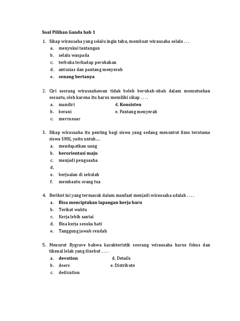 Sikap wirausaha yang selalu ingin tahu membuat wirausaha selalu. Soal Pilihan Ganda dan Jawaban PKK 1Produk Kreatif dan Kewirausahaan Sikap dan Perilaku Wirausahawan Soal - Soal 1Definisi wirausaha adalah aSikap selalu berpikir positif dalam menghadapi segala hal borang yang. Antusias dan pantang menyerah e.