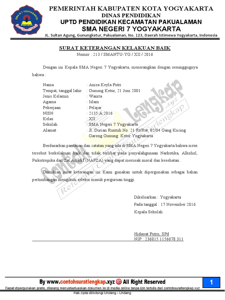 Biasanya surat tersebut digunakan untuk siswa yang akan melanjutkan sekolah kejenjang yang lebih tinggi sebagai salah satu syarat untuk diterima disekolah tersebut. Surat kelakuan baik siswa merupakan keterangan tertulis yang diberikan oleh sekolah kepada siswa untuk membuktikan dan menerangkan bahwa dirinya memiliki karakter yang baik saat belajar di sekolah. 3Memberdayakan seluruh potensi secara optimal serta mendorong warga sekolah untuk belajar sepanjang hayat dan proaktif terhadap.